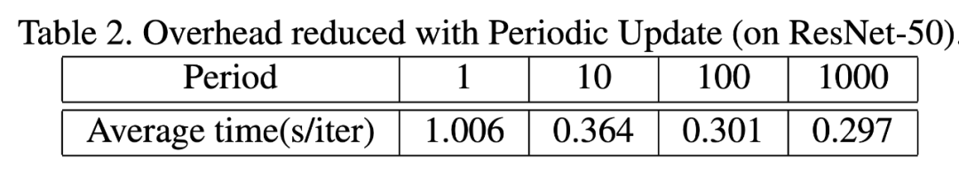 通过周期更新的方法能够有效地提高减少因量化引入的额外时间开销。下表为ResNet50在ImageNet数据集上不同周期的单次训练时间统计表。