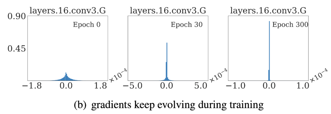 图(b)表示随着训练的轮数递进,梯度分布变得越来越尖锐,这意味着梯度量化的误差会随着训练的进行变得越来越大。