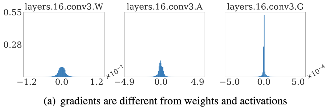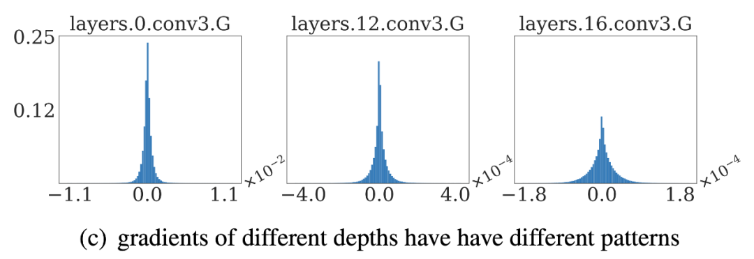 梯度的分布随网络深度变化情况从图(c)中可以看出。很容易发现,卷积层的深度越浅,梯度分布越尖锐,这也会导致梯度量化的误差更大。