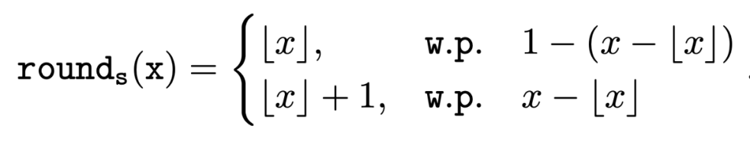 为了降低量化带来的误差,一个常见做法是对取整过程进行随机化,使得取整函数从期望上更接近原始的数,具体随机取整的公式如下: