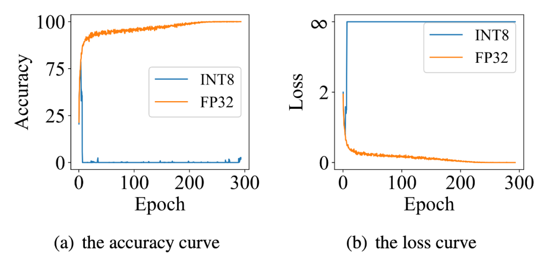 下图展示了在CIFAR-10数据集上进行实验的精度和损失函数变化曲线,以MobileNetv2在CIFAR-10数据集上训练为例,其训练的精度曲线和Loss曲线如下图,从图中可以发现INT8训练的Loss在训练初期正常下降,但随后迅速上升,对应的精度也不断下降。