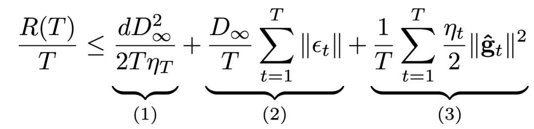 根据以上的观察和初步启发,我们通过理论的分析和推导,对量化训练的收敛稳定性进行建模。根据Adam等相关论文的经验和优化理论中的Regret analysis,本文通过以下公式1和公式2理论推导。