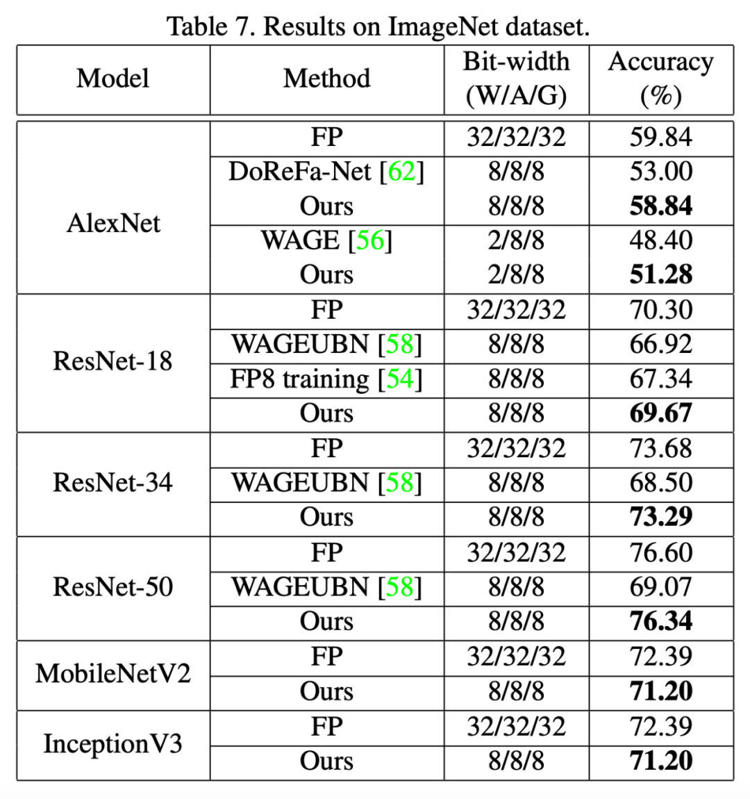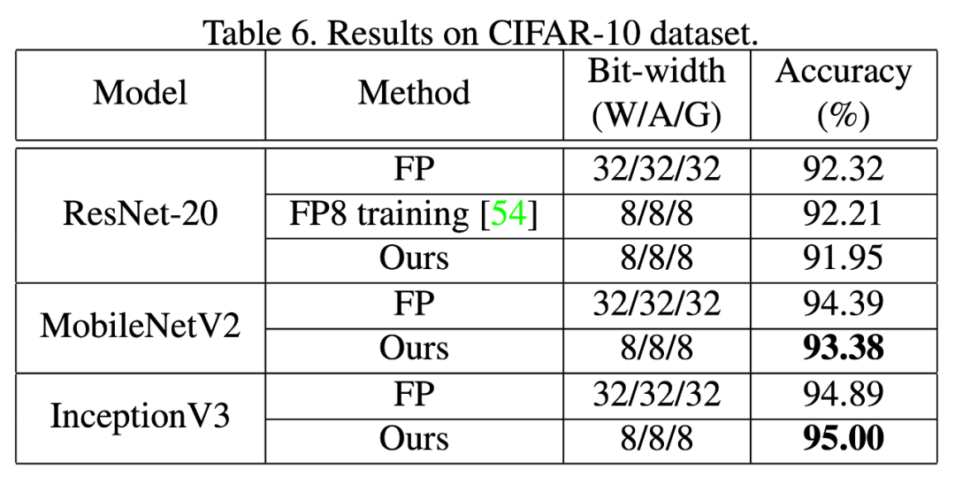 图像分类任务:本文在CIFAR10和ImageNet等图像分类数据集进行INT8训练实验。从下表结果中可以看出,在大多数网络结构中均取得了比现有最好方法更优的精度,并且首次在MobileNet、Inception等网络上进行量化训练实验,精度损失也在1.5%以内。