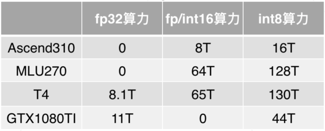 表1:相比行业常用的32位浮点计算(fp32)和16位浮点计算(fp/int6),int8的定点计算在各类芯片的计算力均有2倍以上提升