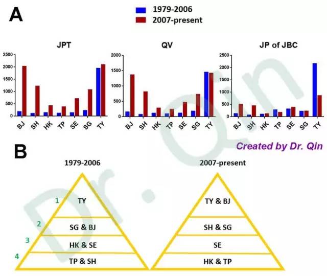 图1: 7大城市在28种期刊发表文章总量 (JPT) 及Q值总量 (QVT) 分析。A. JPT、QVT及JBC发表量的柱状图分析;B. 金字塔划分各大城市在不同时期的研究水平层次。