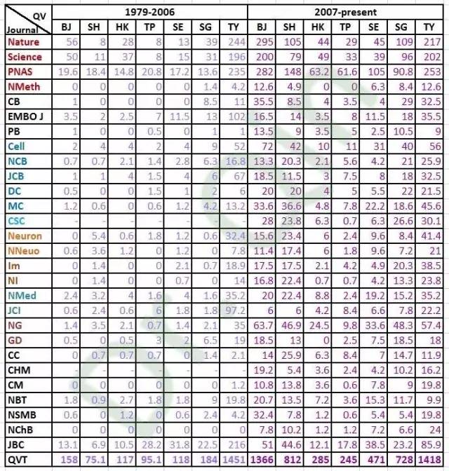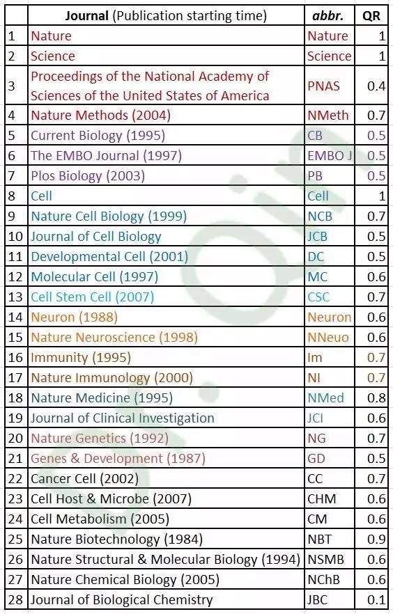 这里的 QR 依据杂志的质量等级和影响力来定义其值,比如顶级期刊 Nature 、Science 及 Cell 定为1,其他期刊大致依靠IF来定,IF≧40的为0.9,30≦IF≦39的为0.8,20≦IF≦29的为0.7,10≦IF≦19的为0.6,IF<10的为0.5。因 PNAS 发文量较大,将其定为0.4。具体信息见表1(1979年以后创刊的杂志均在括号内标注其起始出版时间)。