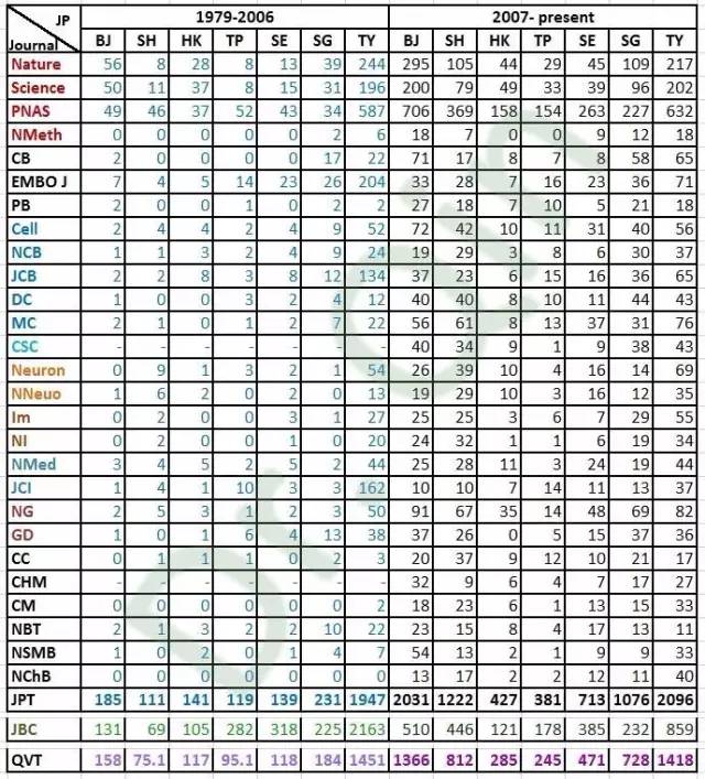 需要指出的是,有“没落贵族”之称的老牌杂志 JBC 在生命科学基础研究领域的影响力也不能小觑,故这里我也做了统计,不过考虑到其IF较其他杂志低很多,且发文量很大,故在 JPT 中并未罗列,而是将其单独做了统计。 但在计算 QVT 时将其纳入,其 QR 定为0.1。