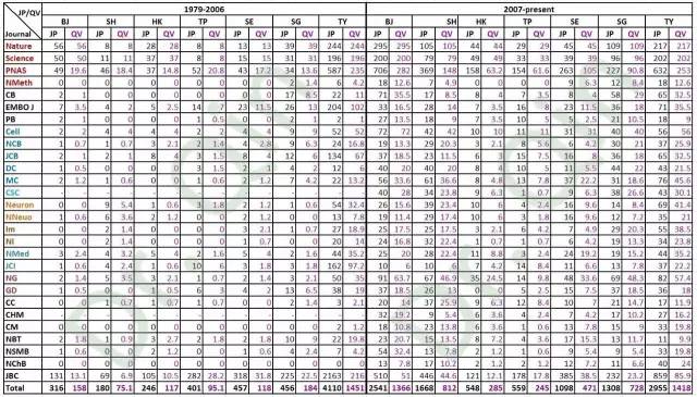 总结:综合以上2个时间段分析,在以上7大城市中上海和北京的增速可谓最快,北京研究实力的突飞猛进结束了东京的亚洲独霸,并与之媲美而笑傲群雄。上海从第一时间段的垫底到第二时间段赶上新加坡并与其位居第二研究梯队,也是令人兴奋的。需要指出的是,上海在此2个时间段在神经科学期刊 (Neuron 与 Nat Neruo) 发表的文章数远高于除东京以外的其他5大城市,说明上海的神经科学研究水平较好 (比如中科院上海神经科学研究所)。新加坡研究实力表现强劲,一直保持在第二研究梯队,并在各个方面均表现突出,值得我们学习。韩国首尔的实力也尚可,始终保持在第三研究梯队。增速最慢的为香港和台北,香港从第三梯队下滑到和台北一起垫底,这也值得当地政府和学者思考。另外,我们从以上数据中可以发现排除 JBC 的27种期刊的 JPT 与包含 JBC 的28种期刊的 QVT 的发展趋势大致一致,这不仅说明这两种方法切实可行,且可证实我们的分析结果较为可靠。