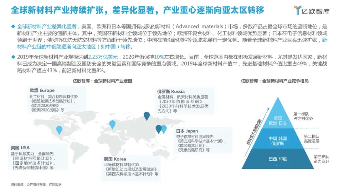 全球新材料产业差异化显著,美国、欧洲和日本等国拥有成熟的新材料(Advanced materials)市场,多数产品占据全球市场的垄断地位,是新材料产业主要的创新主体。其中,美国在新材料全领域位于领先地位;欧洲在复合材料、化工材料领域优势显著;日本在电子信息材料领域领跑于世界;俄罗斯在航天航空材料等方面趋于领先地位;中国在前沿新材料等领域发展有一定优势。随着全球新材料产业巨头迅速扩张,新材料产业链的中低端逐渐向亚太地区(如中国)转移。