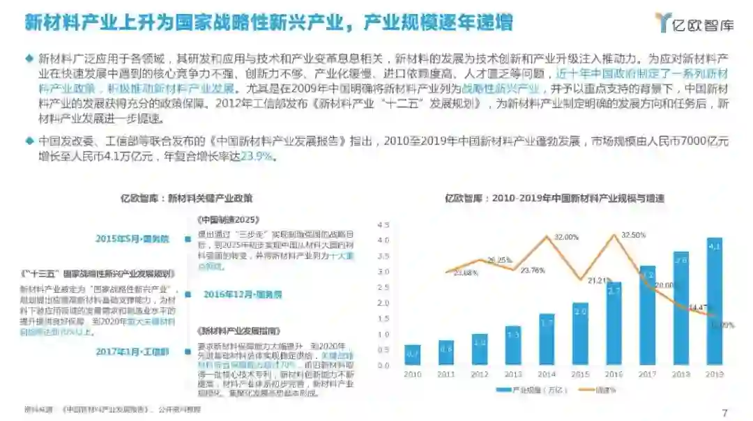 中国发改委、工信部等联合发布的《中国新材料产业发展报告》指出,2010至2019年中国新材料产业蓬勃发展,市场规模由人民币7000亿元增长至人民币4.1万亿元,年复合增长率达23.9%。