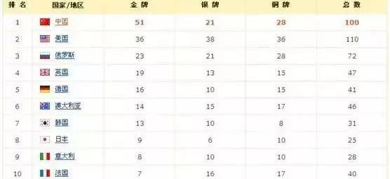 中国一共得了100枚奖牌