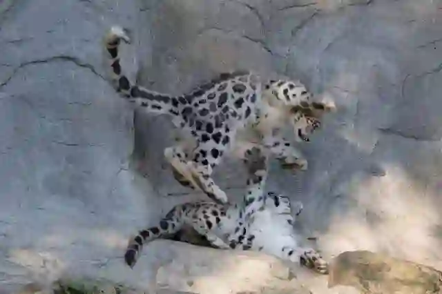 苏黎世动物园,八个月大的两只小雪豹在玩耍。图片:Peter Bolliger / Zoo Zurich