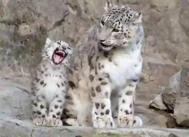 每年的一到三月是雪豹的发情季,这段时间,它们经常在傍晚到凌晨之间嗷呜嗷呜地喊话,寻找另一半。雌性雪豹每次发情约持续一周,通常在春季交配,妊娠期约为三个月,在四到六月份生娃。雪豹一胎一般可以生两到三个娃,小雪豹在长到一岁半到两岁的时候离开母亲独立生活,因此,雪豹的生育间隔约为两年。