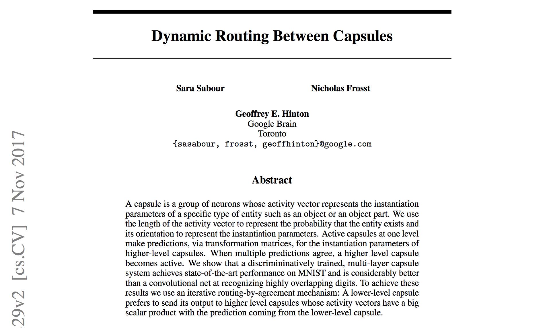 今年11月7日,Geoffrey Hinton老爷子发表了“Dynamic Routing Between Capsules”的论文,提出了“胶囊网络”,胶囊网络在MNIST手写数字识别上的表现超过了CNN,一时引发了热议。