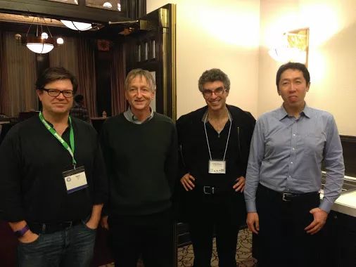 左起Yann LeCun,Geoffrey Hinton,Yoshua Bengio,Andrew Ng(图片来自吴恩达Facebook页面)