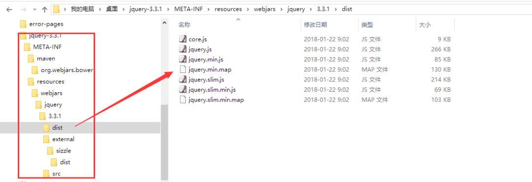 开始使用前,我们看下Jquery的webjars,借此来了解下webjars包的目录结构。以下是基于jquery-3.3.1.jar: