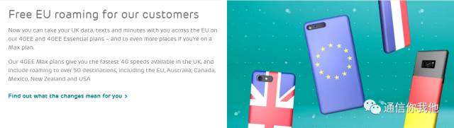 由于欧洲一体化的关系,越来越多英国人的活动区域遍布整个欧洲。在EE推出的所有月缴套餐中,语音、短信和流量的使用区域都是全欧洲。以最贵的套餐为例,每月缴纳26英镑(约合人民币224元),包含25GB高速4G上网流量,无限制的语音、短信和Wifi服务。值得注意的是,套餐的使用区域不仅包括整个欧洲,还包括另外5个国家(美国、澳大利亚、加拿大、墨西哥以及新西兰)。而最便宜的套餐,每月缴纳10.99英镑(约合人民币94.5元),包含全欧洲范围使用的250分钟通话时长,无限制短信条数以及250MB流量,流量使用的峰值速率被限制在60Mbps。