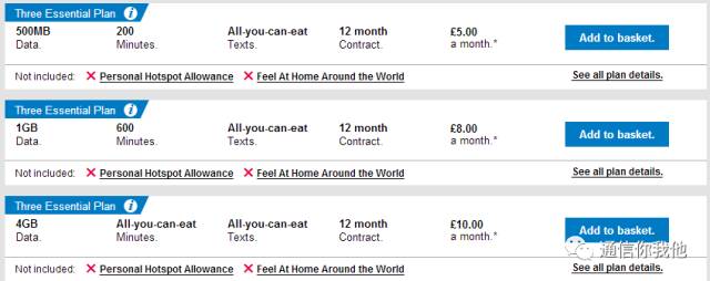 Three的套餐分为价格较便宜的Essential Plan和价格较贵的Advanced Plan两大类。以Essential Plan为例,最便宜的套餐每月仅需5英镑(约合人民币43元),包含500MB手机流量,200分钟通话时长以及无限制的短信条数。而最贵的套餐每月也仅需10英镑(约合人民币86元),包含4GB手机流量,无限通话分钟数以及无限短信条数。当然,套餐的适用范围是全欧洲,这一点和英国其他运营商一样。