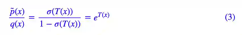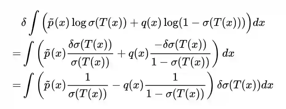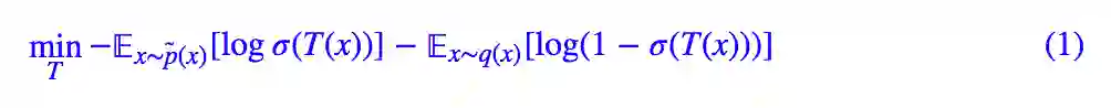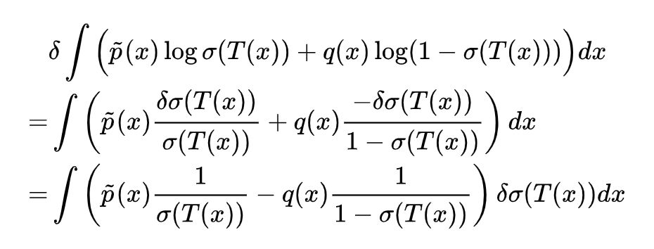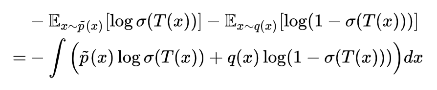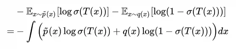 首先,我们来回顾一下标准 GAN 的流程。设真实样本分布为 p̃(x),伪造样本分布为 q(x),那么固定生成器后,我们来优化判别器 T(x):