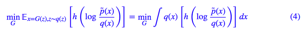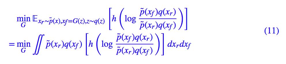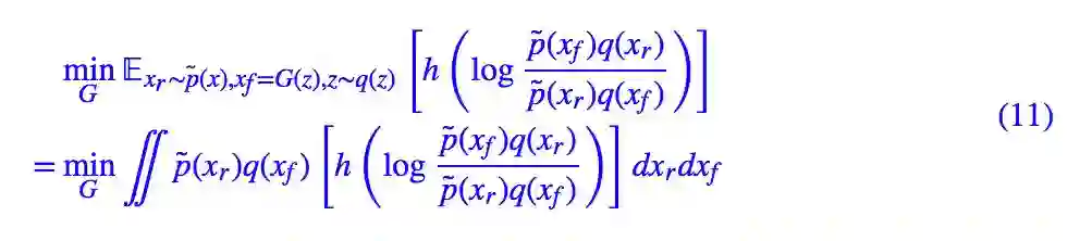 写成最后一个等式,是因为只需要设 f(t)=h(log(t)),就能够看出它具有 f 散度的形式。也就是说,最小化 (2) 就是在最小化对应的 f 散度。关于 f 散度,可以参数我之前写的 f-GAN 简介:GAN 模型的生产车间 [1]。