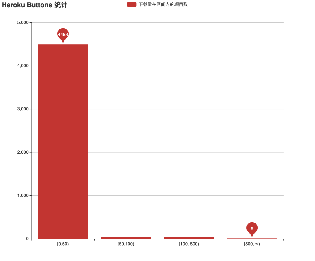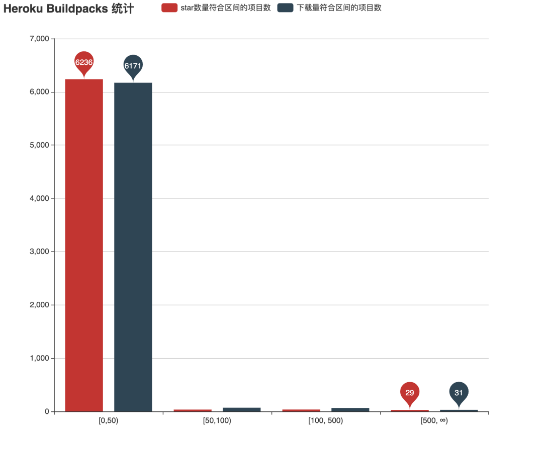 我们可以看到,Buildpack 只能在 Heroku 平台使用,所以 star 数量代表了大家对项目的关心,而下载量则代表了用户的使用频度。图中,6000 多个 Buildpack 的 star 数和下载安装量均在 50 以内,而超过 500 个 star 和 500 次下载部署的项目均只有 30 个左右。再来看 Buttons 中的项目,由于这些项目本身还可以部署到 Heroku 以外的其他平台,所以就只看在 Heroku 的部署下载量反映大家的使用频度,而图中超过 500 次部署的 Buttons 项目只有 6 个。原来这一切竟只是表面繁荣。