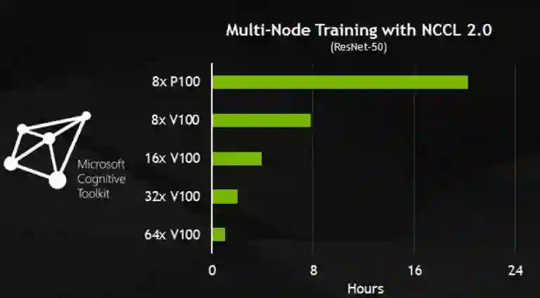 在多GPU上,性能随规模越大变得越好。例如,使用 NVIDIA 的最新Volta GPU,V100那个,可以看到使用从8个到64个V100,性能越来越好。