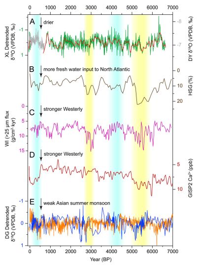 去趋势后的陕南石笋氧同位素记录(A)、和北大西洋冰飘碎屑(B)、西风(C、D)以及夏季风强度记录(E)的对比
