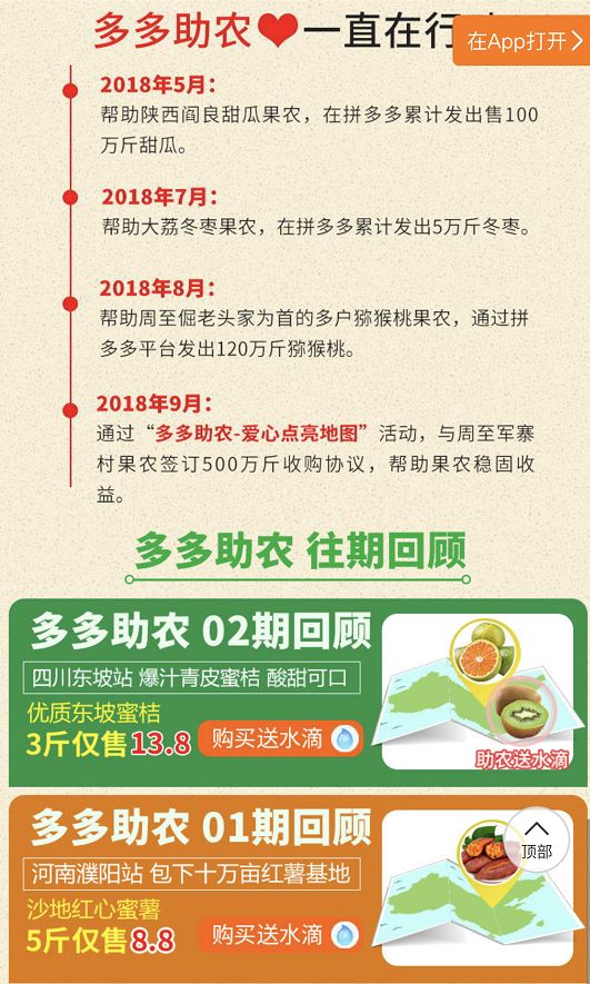 2018年拼多多上线多款产品尝试创新助农扶贫,其中5月上线的“多多果园”,可以让用户在线上虚拟的果园中种下树苗,并以社交、互动方式育果。果实成熟后,用户将免费收到一份由拼多多寄出的扶贫水果,其大多来自四川大凉山、新疆南疆等国家脱贫攻坚的重点地区。目前,多多果园每天送出的水果已经超过100万斤,消费者种下的每一株果树,都代表着贫困地区果农有望实现增收。