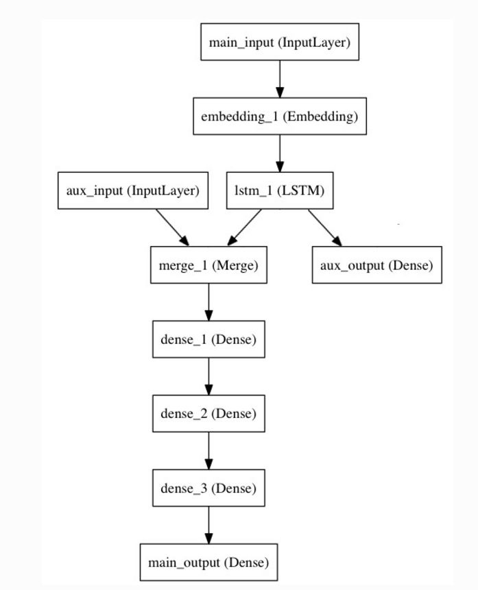 model = Model(inputs=[main_input, auxiliary_input], outputs=[main_output, auxiliary_output])