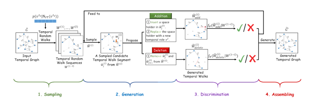 在前一阶段,我们通过逐步对提取的真实时间随机游动进行局部操作来生成合成的时间随机游动。在这一阶段,我们将所有生成的时间随机游走集合在一起,生成时间交互网络。
