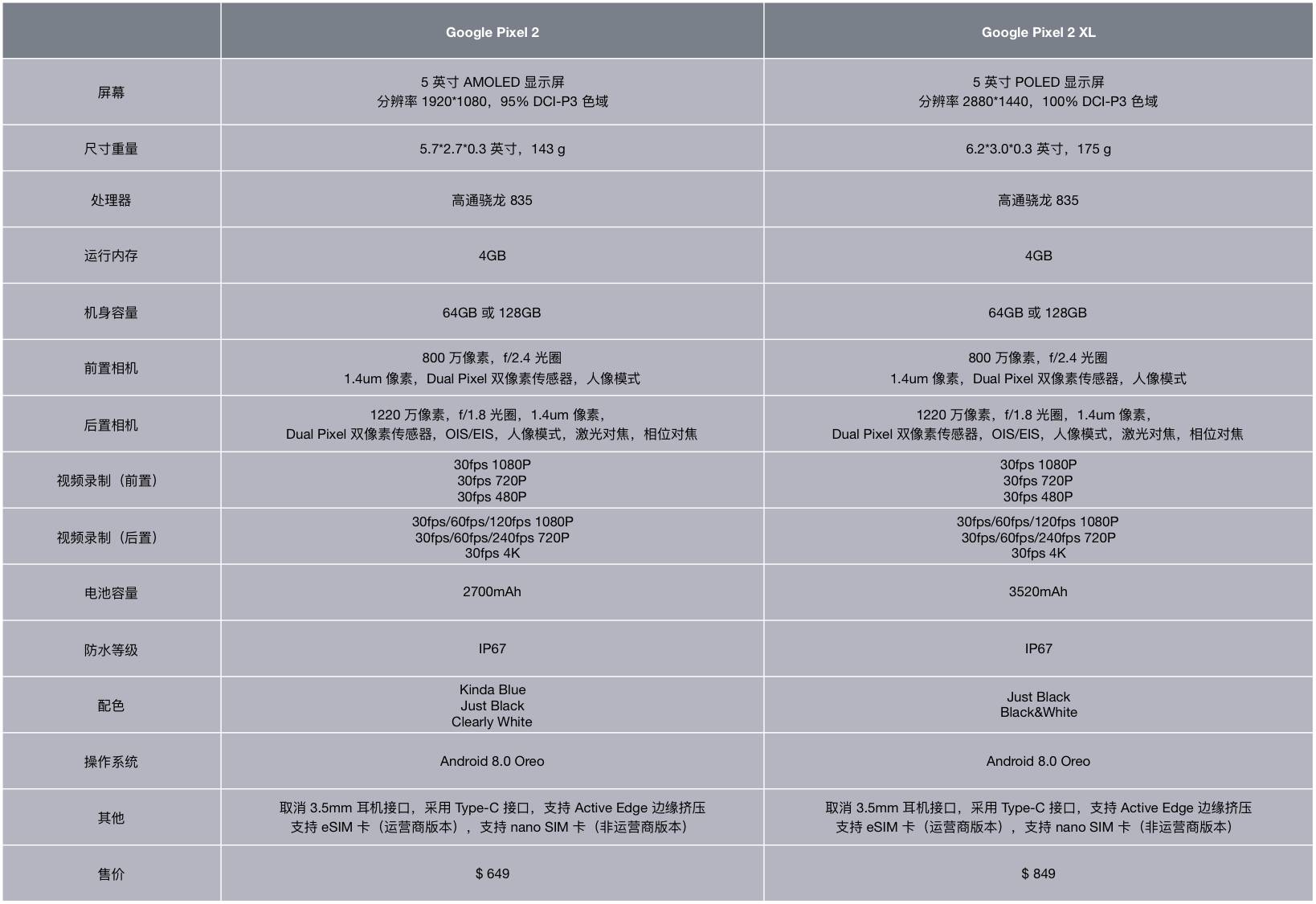 作为本场发布会中最重量级的产品,Pixel 2 和 Pixel 2 XL 在配置及外观方面与此前的爆料(谷歌钦定「全面屏」:直接对标 iPhone X)保持一致。配置方面,Pixel 2 和 Pixel 2 XL 均使用了高通骁龙 835 处理器,配备 4GB RAM,有 64GB ROM 和 128 GB ROM 两种规格可供选择,详细参数已为大家整理如下: