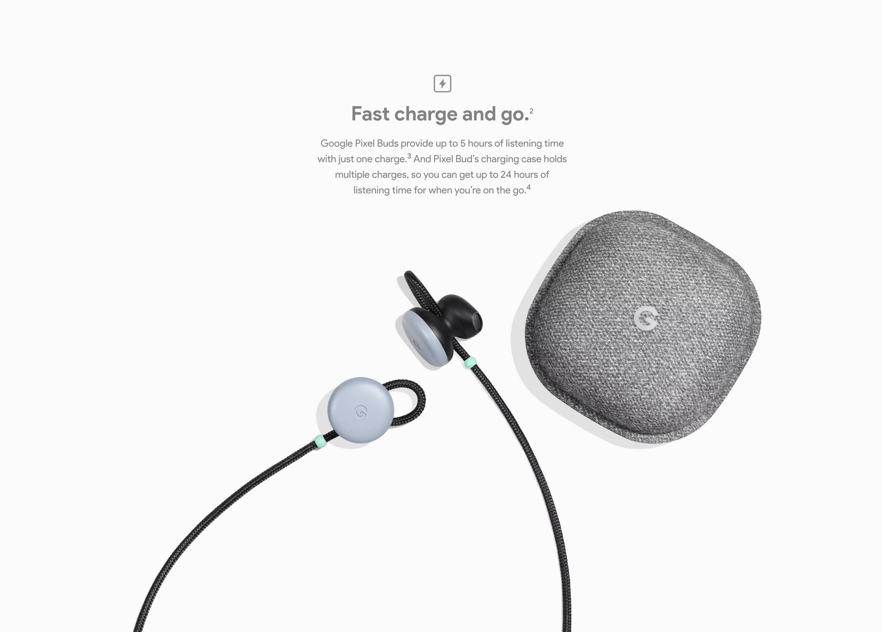 续航方面,Google Pixel Buds 可以提供连续 5 小时的电量,搭配充电盒则可实现 24 小时的续航成绩。