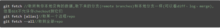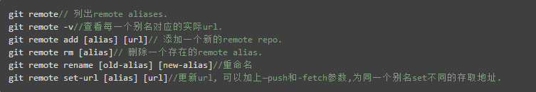 因为不需要每次都用完整的url,所以Git为每一个remote repo的url都建立一个别名,然后用git remote来管理这个list,如果你clone一个project,Git会自动将原来的url添加进来,别名就叫做:origin
