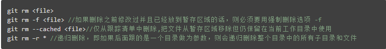 如果只是简单地从工作目录中手工删除文件,运行 git status 时就会在 Changes not staged for commit 的提示。要从 Git 中移除某个文件,就必须要从已跟踪文件清单中移除,然后提交: