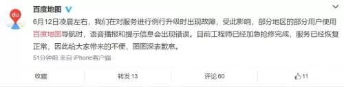 6月12日凌晨左右,我们在对服务进行例行升级时出现故障,受此影响,部分地区的部分用户使用百度地图导航时,语音播报和提示信息会出现错误。目前工程师已经加急抢修完成,服务已经恢复正常,因此给大家带来的不便,图图深表歉意。