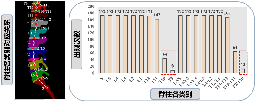 训练集中各类别样本数量严重不平衡,包含T9, T10,T9/T10这三个类别的图像分别仅占总样本量的4%、25%和7%,如下图所示。这导致这三类的分割结果在验证集中很不理想,单类准确率远低于其他类别的平均水平。为解决这一问题,团队对包含这三个类别的图片进行了针对性的手工裁剪,改变了训练图片中小样本类别的体积,从而构造了44张包含小样本类别的训练图片。团队用到的其他trick还包括:①在线数据增强,通过随机旋转-15°至15°、随机弹性变形、随机对比度调整等方法在线增强训练数据,提高模型的泛化能力;②学习率衰减策略,设置初始学习率为0.001并在90和144轮时将其调整为原来的0.2倍,从而使网络快速收敛到最优点;③提前停止,当验证集的评价指标停止增长时,及时停止训练,从而缩短训练时间。