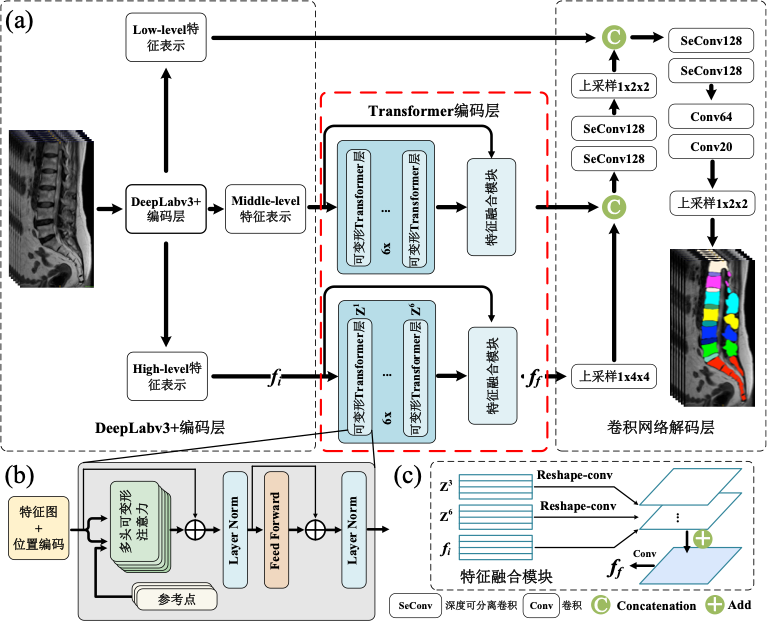 (a) 算法总流程图,主要包括基于DeepLabv3+的图片信息编码层,使用可变形Transformer建模全局上下文信息以及一个语义信息解码器以获得最终多类别分割结果。(b) 可变形Transformer模块。(c) 特征融合模块。