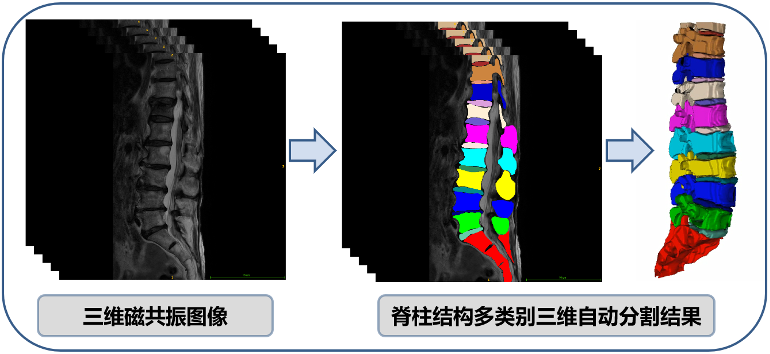 磁共振图像中脊柱结构包含多个类别(椎骨,椎间盘),下图中不同颜色代表脊柱结构不同的类别,可以看出本队提出的方法能够准确实现三维磁共振图像中脊柱结构的多类别分割。
