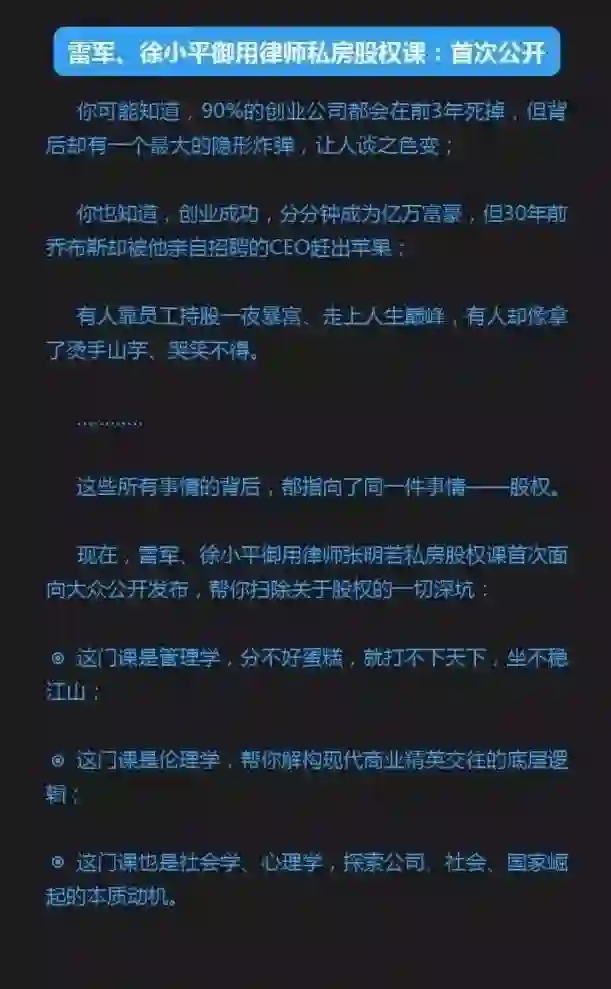或许不甘于平庸的你,对雷军如何创立小米的故事,如数家珍,或许你对徐小平当年为何选择投资陈欧的故事,倒背如流,但真正决定你和大佬之间差距的是,对企业股权的认识!