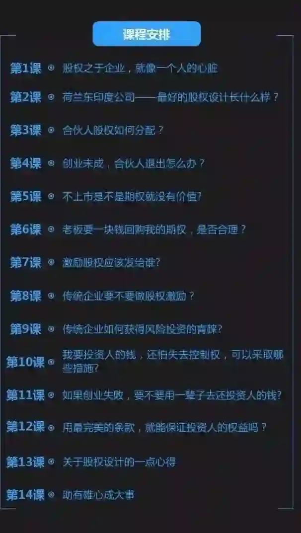 惊心准备的课程(14期课程+数十期专项音频答疑):可以让那些经验不足的创业者,迷惑的员工,不理解创业投资模式的投资人、传统企业家,都能有机会学习国内最顶尖的股权思想和经验。