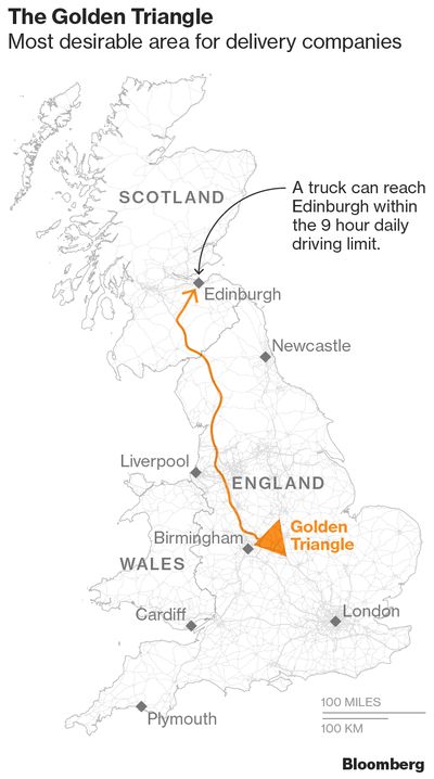 在英国,一些最受送货公司欢迎的地区,比如位于英国中心的所谓金三角,可能会遭受打击,因为货物投递已经不再受制于驾驶员的换班。长期以来,像亚马逊(Amazon.com)这样的公司不得不在该地区(其独特优势是,它距离英国大部分地区只有一个班次的车程)建立物流中心,由此推高了当地的仓库租金。