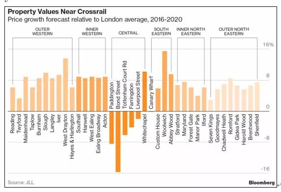 伦敦横贯铁路(Crossrail)附近的房产价格:相对于2016年至2020年伦敦房产均价的涨幅 数据来源:仲量联行