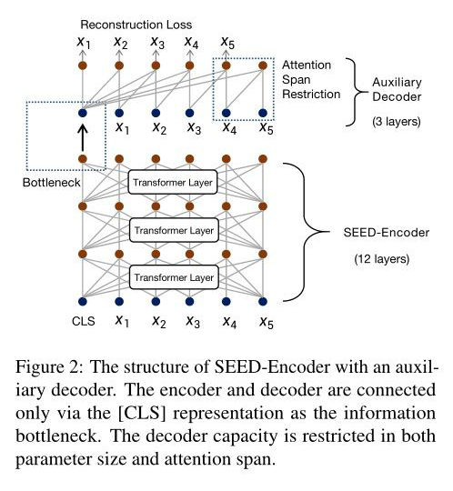 这样,加强了编码器和解码器间的信息瓶颈,迫使解码器依赖于编码器的 CLS 表示,推动编码器学习到更有信息的表示。