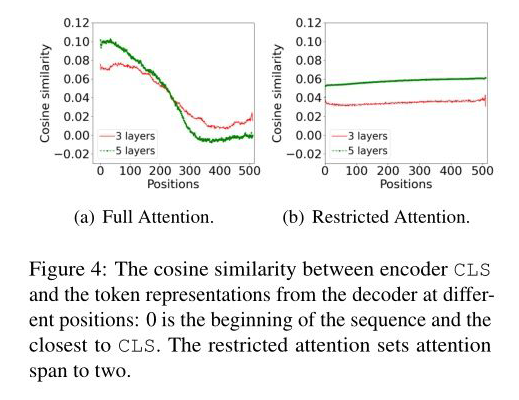 为进一步探索编码器的 CLS 与解码器间的关系 ,作者绘制了解码器最后一层的 token 表示与编码器的 CLS 向量间的余弦相似度。可以看出:限制注意力大小的影响是显著的,在 full attention 下,解码器在一开始严重依赖编码器的 CLS 向量,但当有足够上下文信息后,很快就降低依赖;在 restricted attention 下,对上下文访问受限,解码器被迫在所有的 token 位置处都要更多地关注编码器的 CLS 向量。