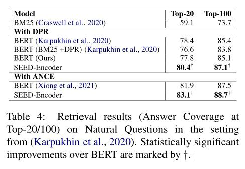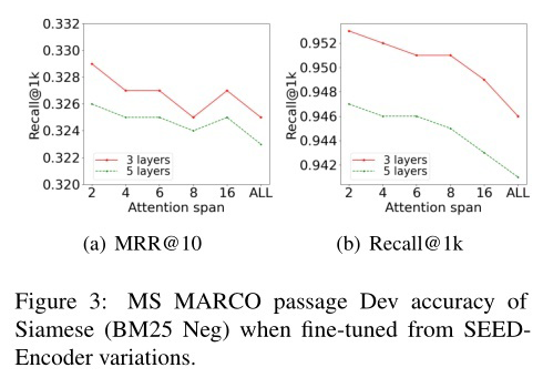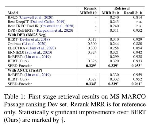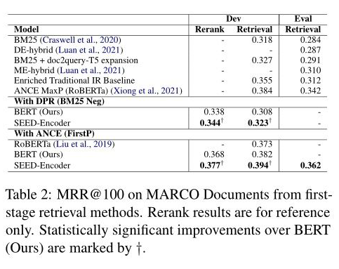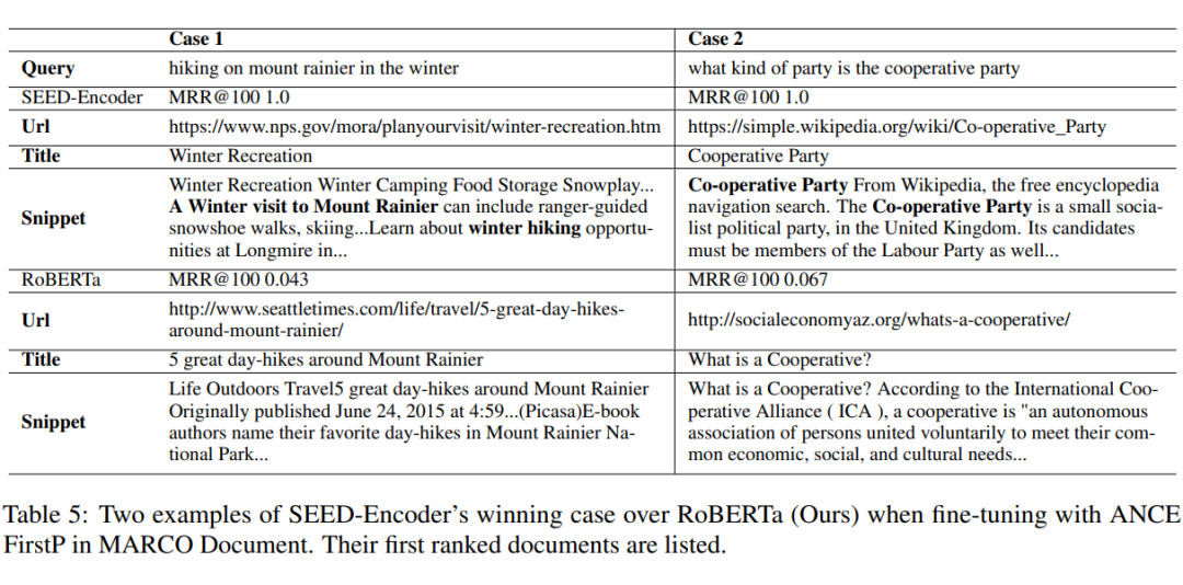 在 MARCO document retrieval 中,ANCE(FirstP)每篇文档只使用第一个段落中的一个向量,而 ANCE(MaxP)从其前四个段落中为每个文档使用四个向量,这些向量通常就覆盖了整个文档的主体。但是以 SEED-Encoder 为起点,ANCE(FirstP)比最先进的 ANCE(MaxP)with RoBERTa 的性能还要高出 6%,同时每个文档使用了更少的 embedding。这也证实了在语料库规模超过数十亿的真实搜索系统中,减少每个文档所需的 embedding 是很重要的。