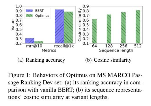 Optimus 模型是在 MS MARCO 上的 BERT 加了一个 GPT-2,作者将其与 BERT 对比,使用 MRR 和 Recall 作为评价指标。结果见图1(a)。可以看出  Optimus 在密集检索任务上的性能比 BERT 差,该结果与 Optimus 在其他语言任务上的性能形成鲜明对比,如 GLUE 基准测试。