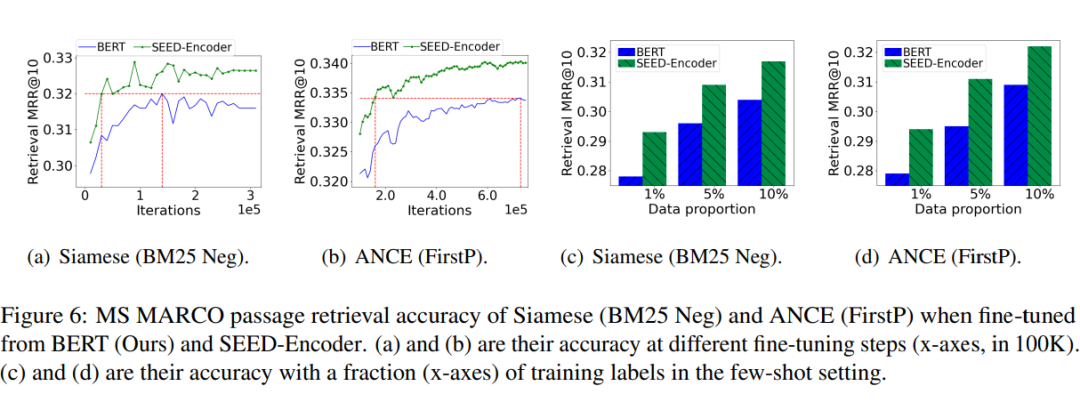 从 SEED-Encoder 开始进行微调,Siamese 和 ANCE 在一开始就实现了更高的检索精度,并在整个微调过程中保持其优势。