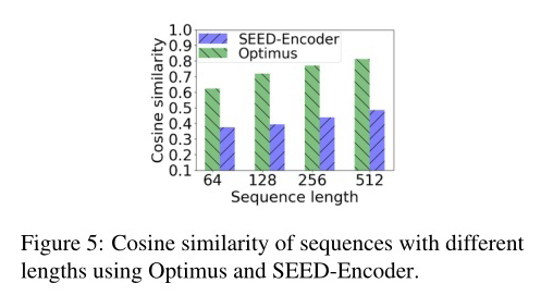 近来有研究表明,长句子很难通过来自预训练模型的单一嵌入向量来表示,为此,作者随机选择了不同长度的序列对,计算 Optimus 的 CLS 向量的余弦相似度。结果见图1(b)。可以看出,Optimus 的长序列表示是非常相似的,该模型对长文本序列产生了杂乱的表示。因此在 MS MARCO 上就 DR 进行微调时,其不能将查询的相似文档与不相似文档分开。需要进一步的微调来重新调整编码。
