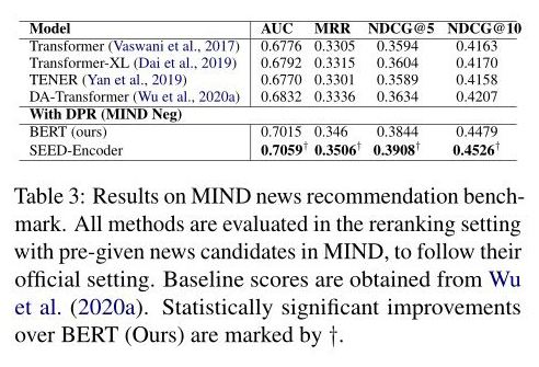 遵循 MIND 的官方设置,使用标准的密集检索模型对预先给出的候选新闻文章重新排序。使用 SEED-Encoder 对用户历史和候选文章进行编码,并将它们与点产品进行匹配。