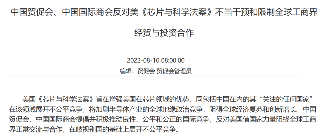 针对美国的《芯片与科学法案》,中国国际贸易促进会、中国国际商会发布了「反对美《芯片与科学法案》不当干预和限制全球工商界经贸与投资合作」的声明。
